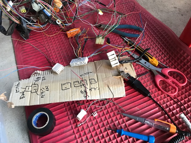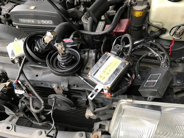 雨で足元が ぐずぐずです 茶屋おやぢの作業も グズグズ 細かいとこに 手が入らないので エアクリもバッテリーもバラしました そして 不具合のHID撤去 標準のH4バルブに交換 だいぶ合格ラインに近づいてきました あと少し やっつけないと。