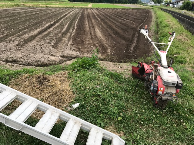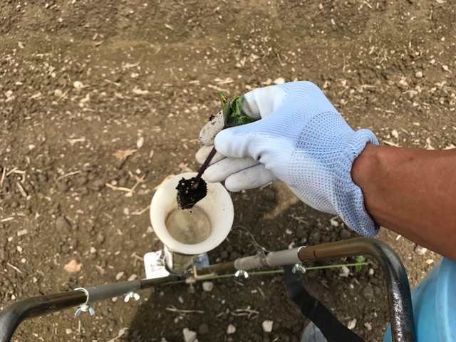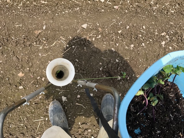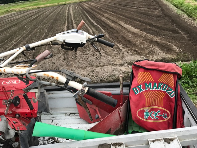ついに梅雨っぽい空模様になってきました あいかわらずアグリ茶屋おやぢ 黒豆の植え付け中 苗を筒の中へ ほりこんで 植え込みします 柄の長さを伸ばして正解! 腰への負担が軽減されました 後半の植え付けに向けて 肥料を撒いて管理機で整地 背負いの肥料散布する道具 なんとも非動力なシンプル設計 ネーミングも分かりやすいね