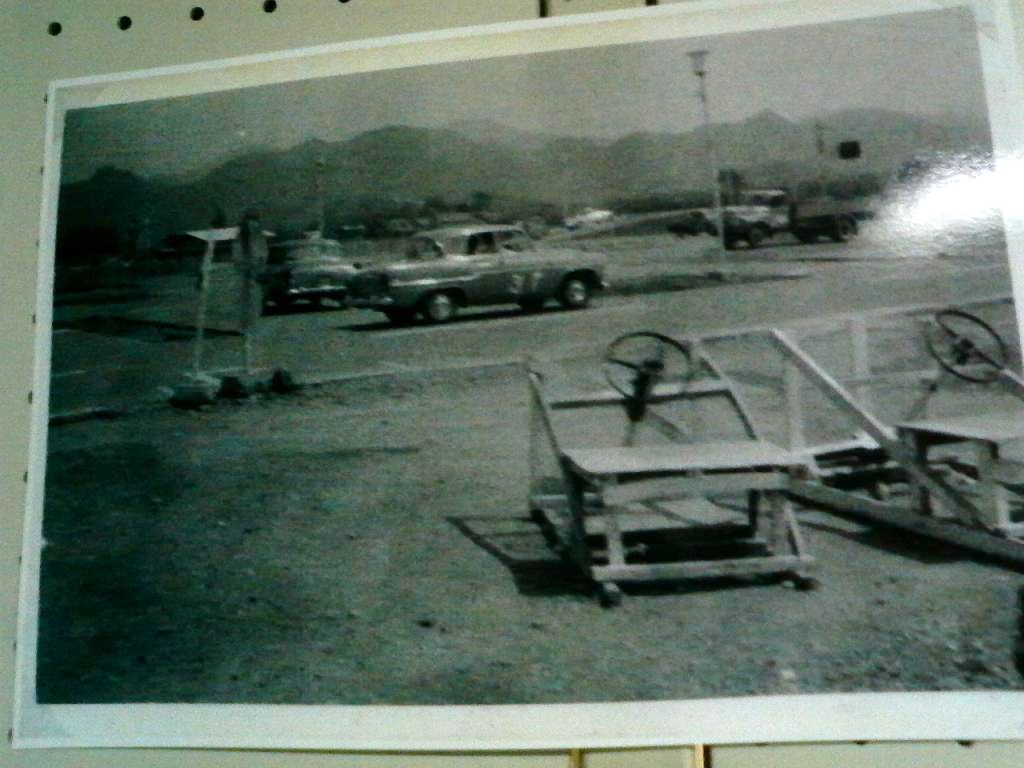 手前に写る 木組みにハンドルが付いたドライブ・シュミレーター?