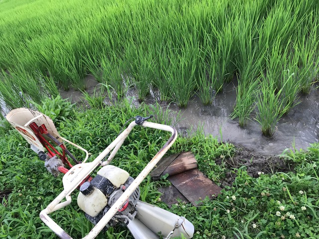 豪雨が過ぎ去って 本格的な暑さがやってきた 村の田畑も後処理が続いてますが 少し落ち着いた雰囲気です 茶屋の浸水も引いたので 土間を乾かす為に 扉を全開して扇風機かけてます 年に一度の出動です 田んぼの溝切りして 田んぼの中干し 本日の訪問者 晴れてきてるので 乾いてくれるでしょう 茶屋おやぢも 泥と汗でビショビショなんやけどね