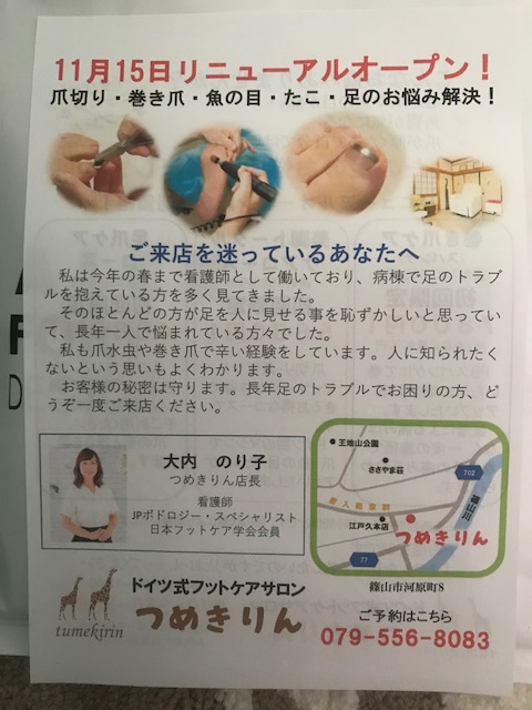 地元で友人が新しい事業を始めるので 少しお祝いの会がありました 人間にとって歩行って大事なのに その足元に問題を抱えてる人って多いらしい ドイツ式フットケア 「つめきりん」 一歩を踏み出そうとする人 少しでも応援できたらいいですね