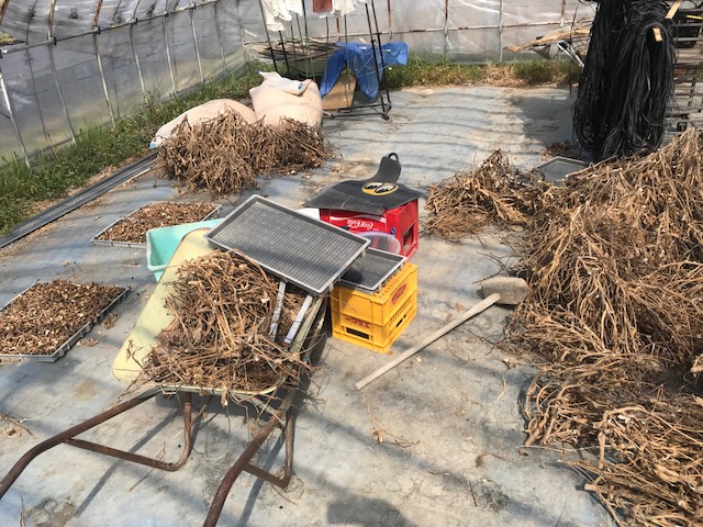 ビニールハウスの黒豆の片づけ