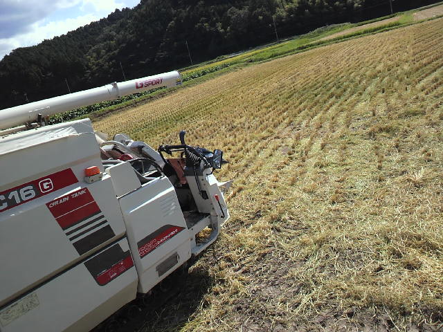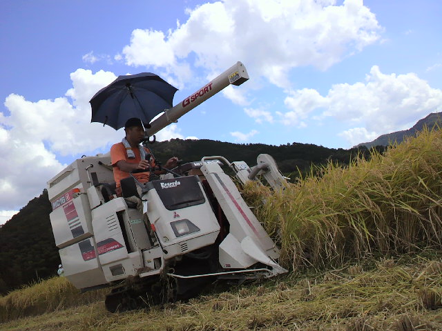 パパも頑張って 稲刈りの操縦を体験