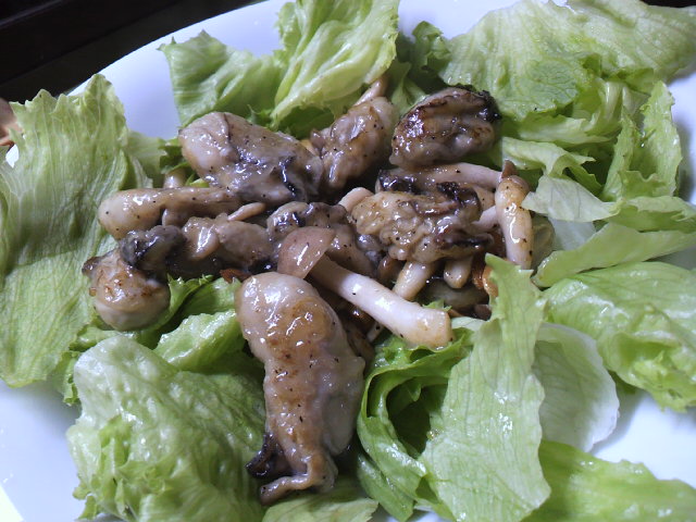牡蠣に片栗粉まぶしてガーリックオイルで炒めてみました