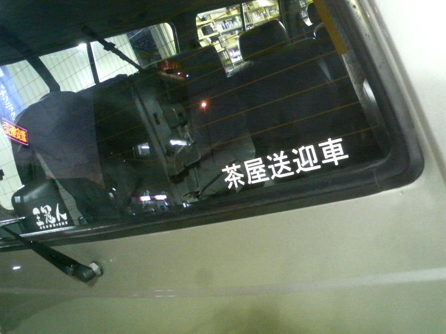 カッティングシートをカッターナイフで 器用に切り抜いて そして完成 茶屋送迎車が走りはじめます OYTの参加者 随時募集中(笑) *カッティングシートの基本作業は あくまでもプロッターによるカットです しかしながらシートから 文字を抜き取るのは手間が掛かる作業です その作業は 職人ワザって・・・