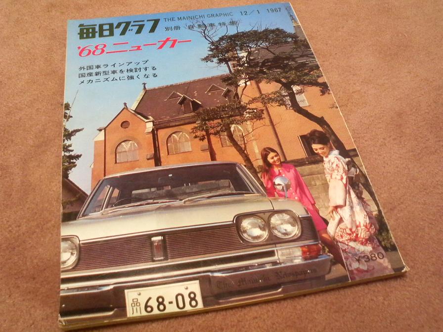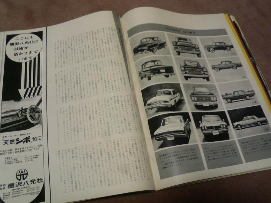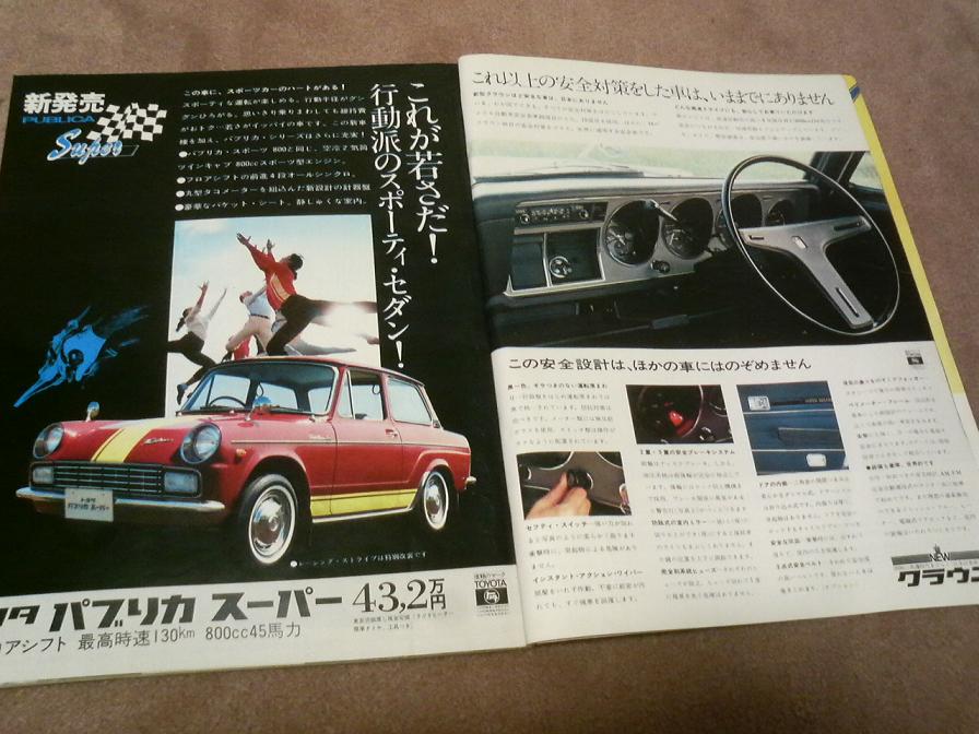 毎日グラフ 別冊 1976年12月号 表紙だけで買ってみましたが・・・ なぜかディーラー板で撮影してますなぁ クラウンの記事は少ないですわ 広告のページが興味深いですね 右のページでは 街道沿いのドライブインが 「高速道路の発達で伸び悩むでしょう」って解説してます ちょうど東名高速が出来て名神高速と繋がり 大阪~東京までノンストップで行けるようになった時代です 高速道路が無きゃ距離ボケって言葉は生まれなかったのかも(笑) パブリカが庶民の味方 スーパー(スポーツモデル)ラジオヒーター標準タイヤ、工具つき 432000円 ストライプは特別注文です